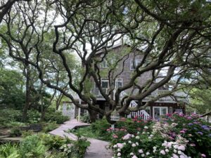 Time honored old fashioned shrubs and flowers are the backdrop for natives of all descriptions. See native ferns galore, blue flag iris, Soloman’s seal, partridge berry, Jack-in-the pulpit, Lynnhaven Carpet, as well as butterfly weed and Stokes aster, including a shoreline protected by natives, like saltbush and wax myrtle.