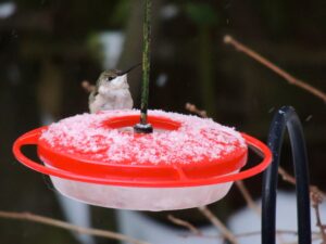 The store has sold out of its heaters designed to keep hummingbird nectar from freezing. Trista photographed one of hers that looks like it is huddled up on the feeder for warmth.