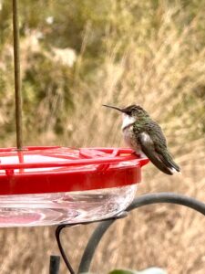 Early this morning as I checked my hummingbird feeder to make sure the nectar wasn’t frozen, one of the bold little critters buzzed me overhead.