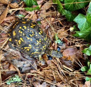 A little box turtle popped out from the mess of ivy on my hill on a warmish, rainy morning last week.