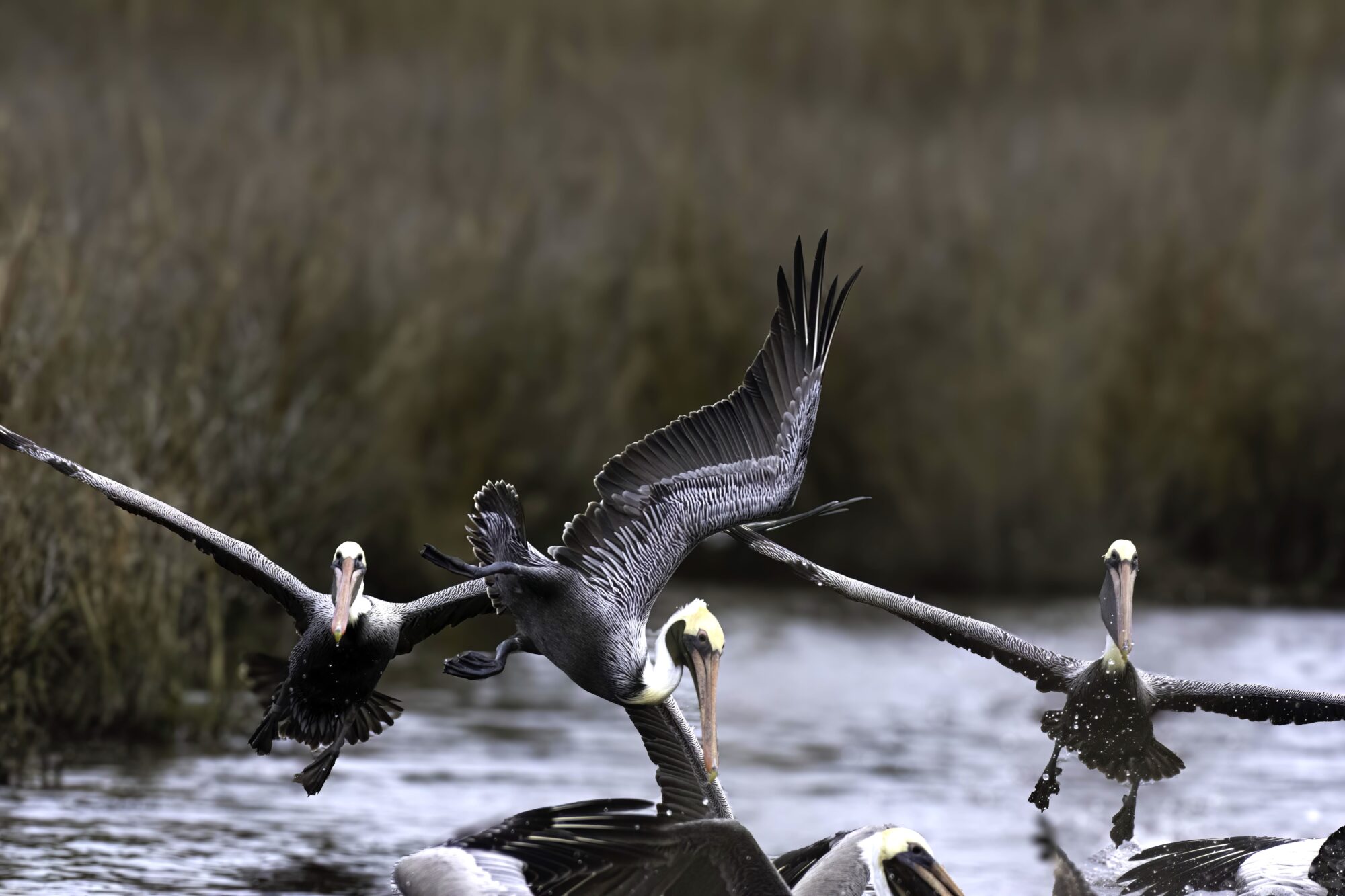 Brown pelicans soaring over the parking lot surprised Teeter shoppers on routine grocery runs, but curious customers only had to look across the road to see what was going on. Scores of the big birds, sometimes a cloud of them, hovered and dove into the Park’s marshy areas hidden behind the grasses.