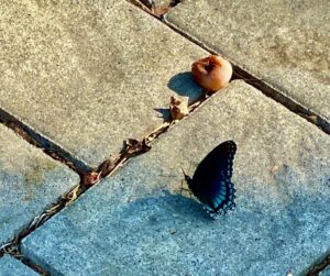 Last year, a delightful red spotted purple butterfly found some ripe persimmons in the driveway and had its own Thanksgiving feast. The little butterfly walked round the driveway looking for the fruits and sipping their oozy nectar like a drunken sailor.