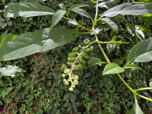 The blooms turn to bright green little berries which then become a brilliant deep red along with the stem, on their way to turning purple. The colors are brilliant enough that the berries were once used as dyes. And these berries are what birds love late summer well into fall.