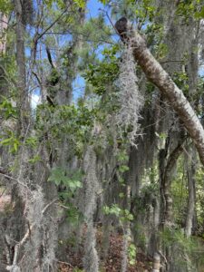 The moss grew, according to Robert who has been tracking osprey in the area of the park for more than a decade, when the male took a liking to Spanish moss as a nest decoration. The moss kept falling from the nest and the bird would bring in more. The loose moss took hold and created a localized Spanish moss garden below. And there was plenty to go round for a cozy nest above.