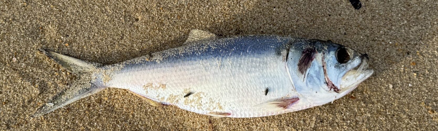 Menhaden kills occur off and on the beach in winter when there are sharp temperature changes, or commercial fishing boat nets break or overflow with thousands of fish that have migrated out of the Bay to the ocean to spawn.