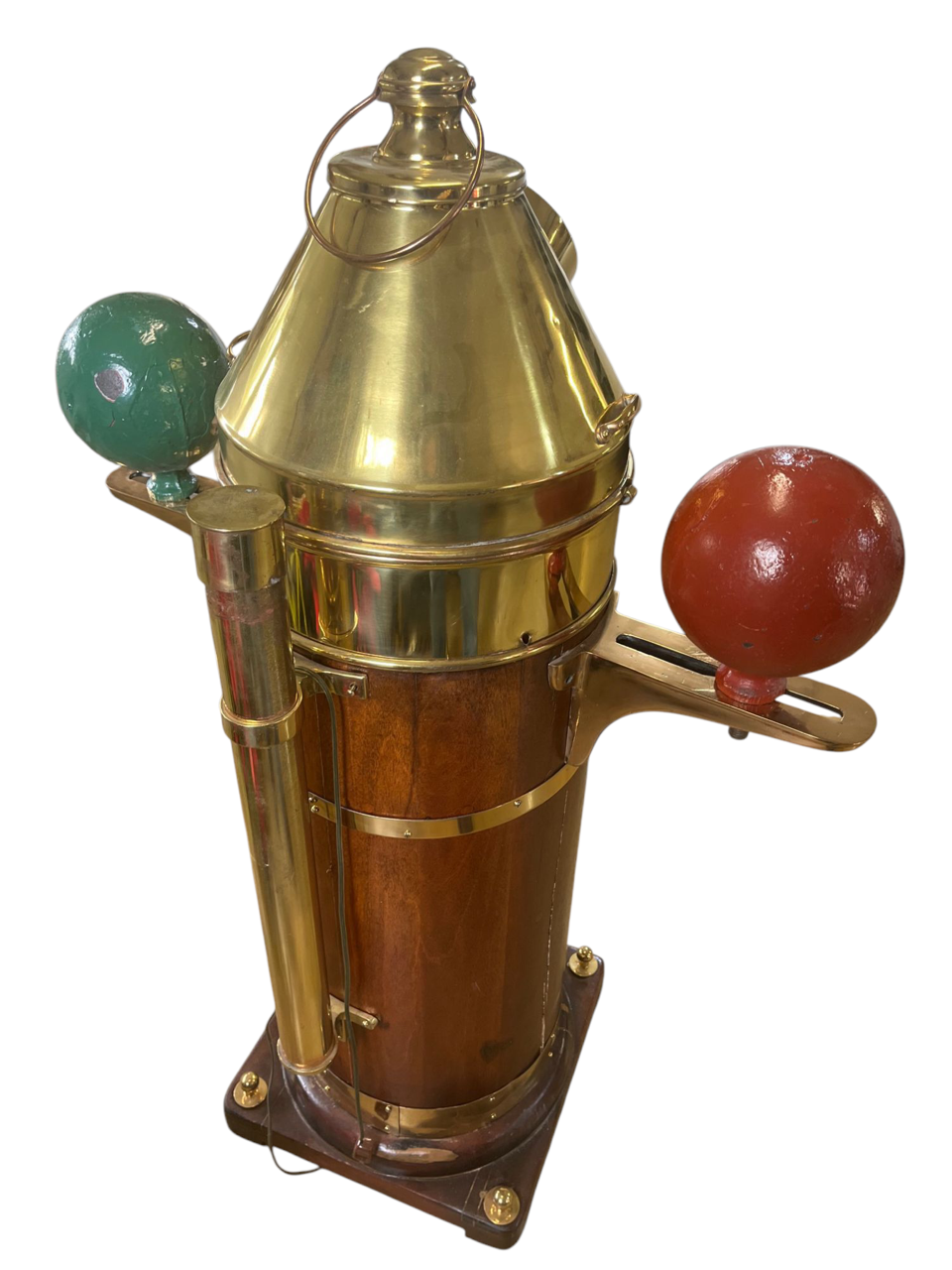 A WWII era ships bridge (wheelhouse) engine order telegraph (E.O.T.) made by the Henschel Corporation of Amesbury Massachusetts. Features face plates of black glass with commands in white lettering, with double-sided drum-shaped top and dual dials. This classic standing pilot house E.O.T. is constructed of heavy solid brass and was used on a single propeller ship. The faceplates include commands on both sides:(ASTERN) FINISHED WITH ENGINE, DEAD SLOW, SLOW, HALF, FULL. (AHEAD) STANDBY, DEAD SLOW, SLOW, HALF, FULL. STOP in center as marked with a brass arrow that moves with the trigger style indicator handles. The indicator handles lock into notched grooves above the commands in the top of the outer rings. Brass electronic side bell is intact and the E.O.T. houses an interior light with on/off switch located at the top of the squared pedestal with flaring base. An electric telegraph rather than mechanical in that the external bell used to ring when orders were changed rather than the internal mechanical bell. The manufacturer’s plate states “HENSCHEL CORPORATION DR.#10-1083 ALT.5 W. 2 CYCLES VOLTS 115.”